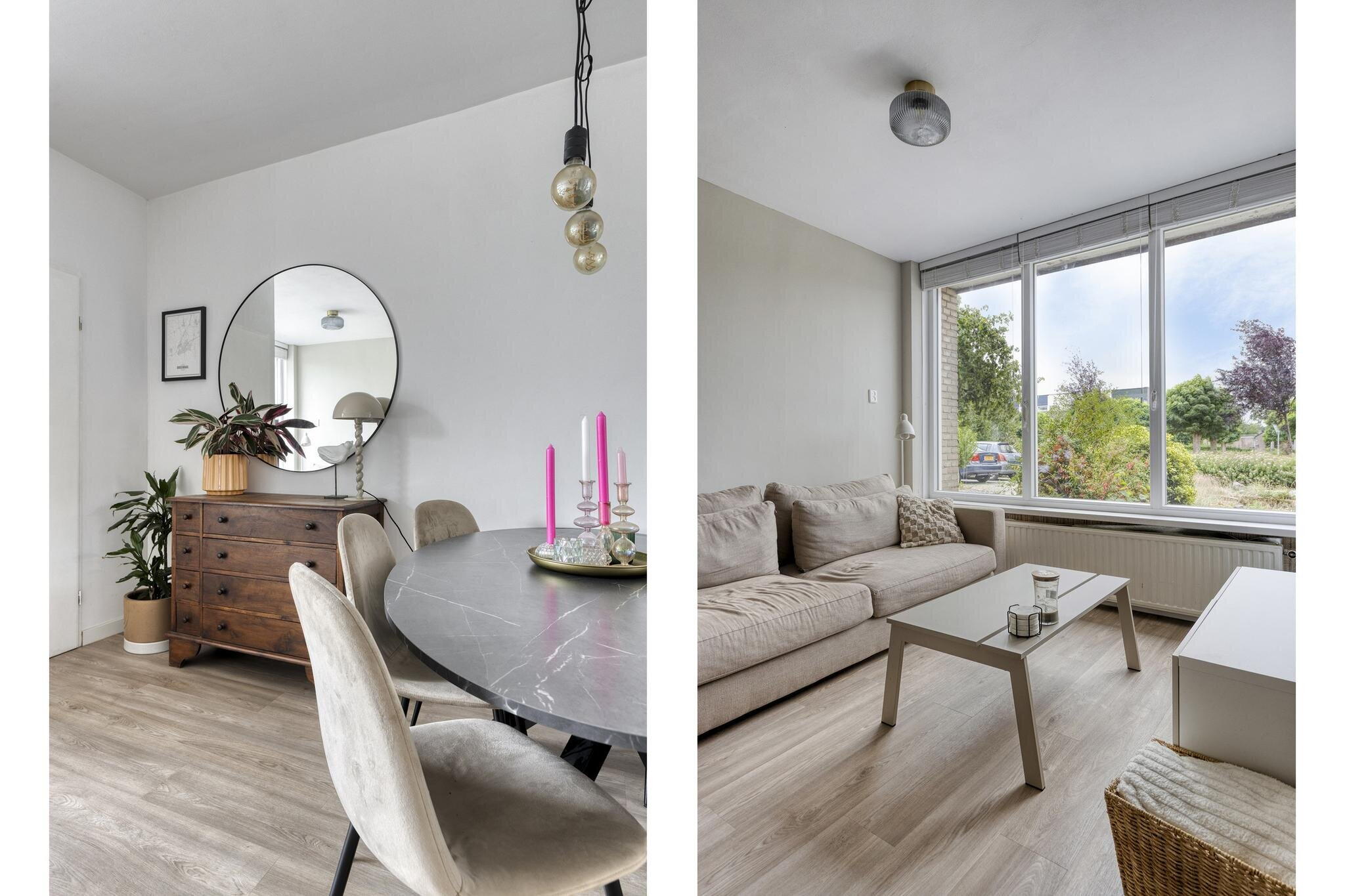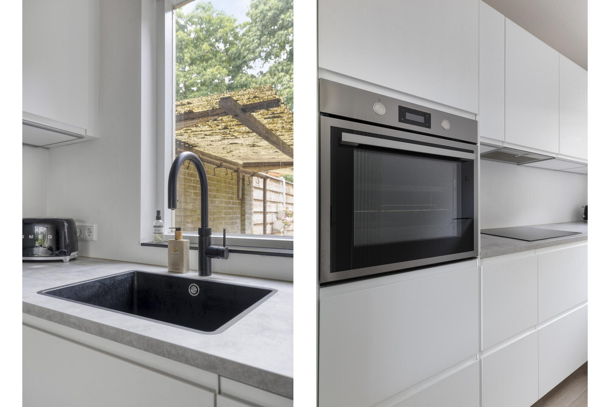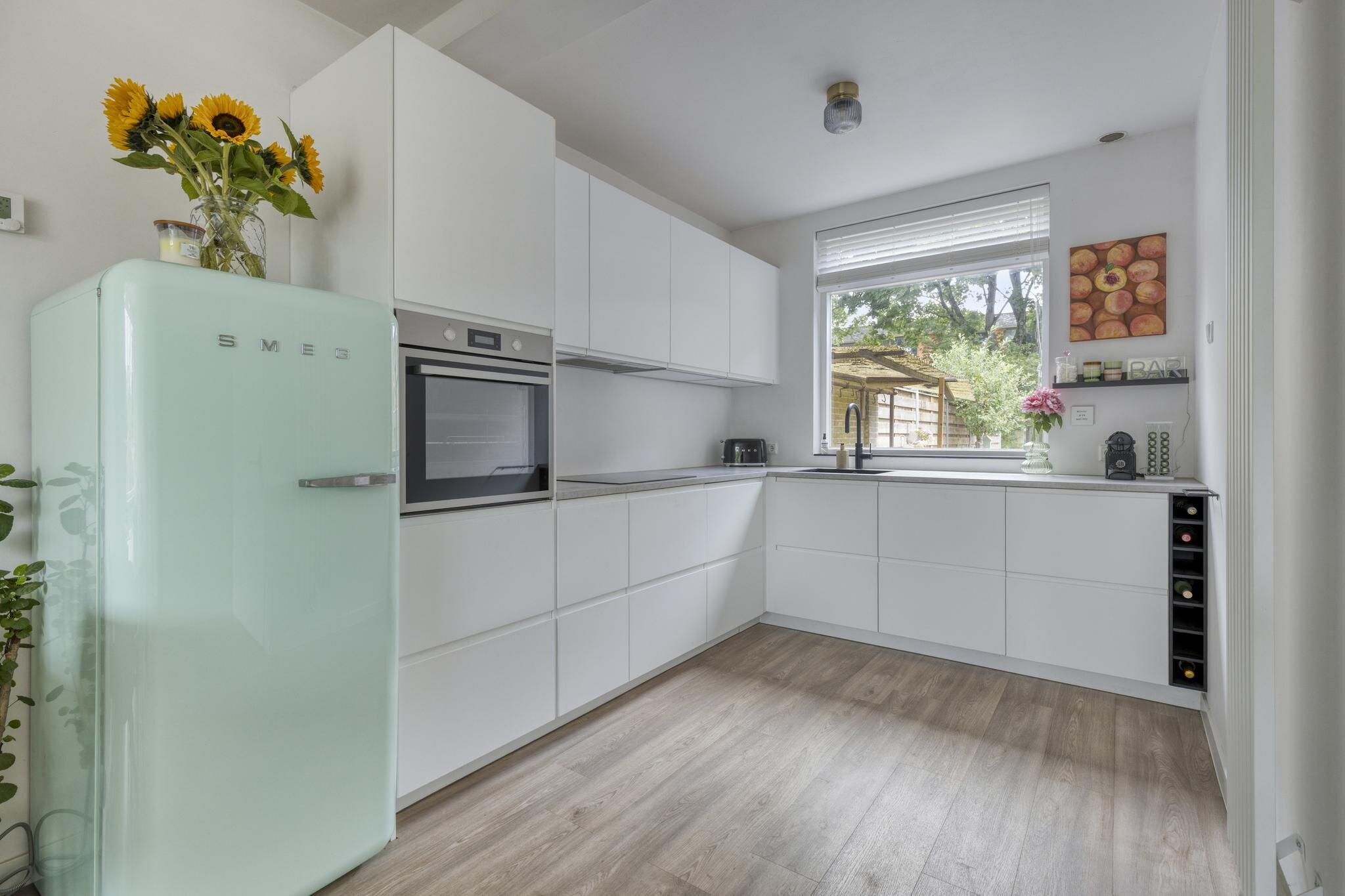 De woonkamer voelt licht en uitnodigend aan. Dankzij de grote ramen aan de voorzijde valt het daglicht rijkelijk naar binnen. Het zitgedeelte bevindt zich aan de voorzijde van de woning, ideaal voor een knusse bankhoek. In het midden van de ruimte is plek voor een eettafel, perfect voor lange etentjes met vrienden of familie. Achterin vind je de strakke, moderne keuken in wit. Greeploos, strak, en van alle gemakken voorzien: kookplaat, oven, afzuigkap, vaatwasser en een luxe Quooker. De losse koelkast kan worden overgenomen. Vanuit de keuken kijk je uit op de achtertuin, wat koken nog net iets leuker maakt!