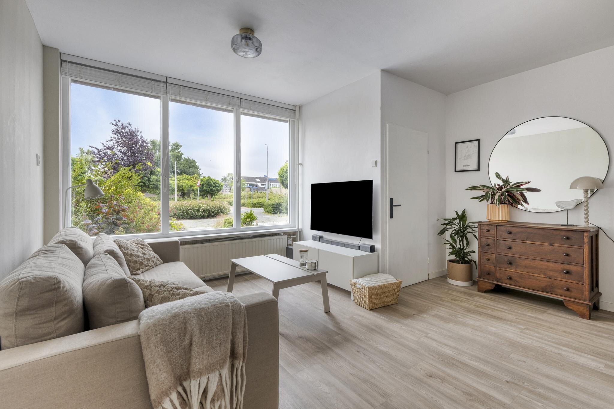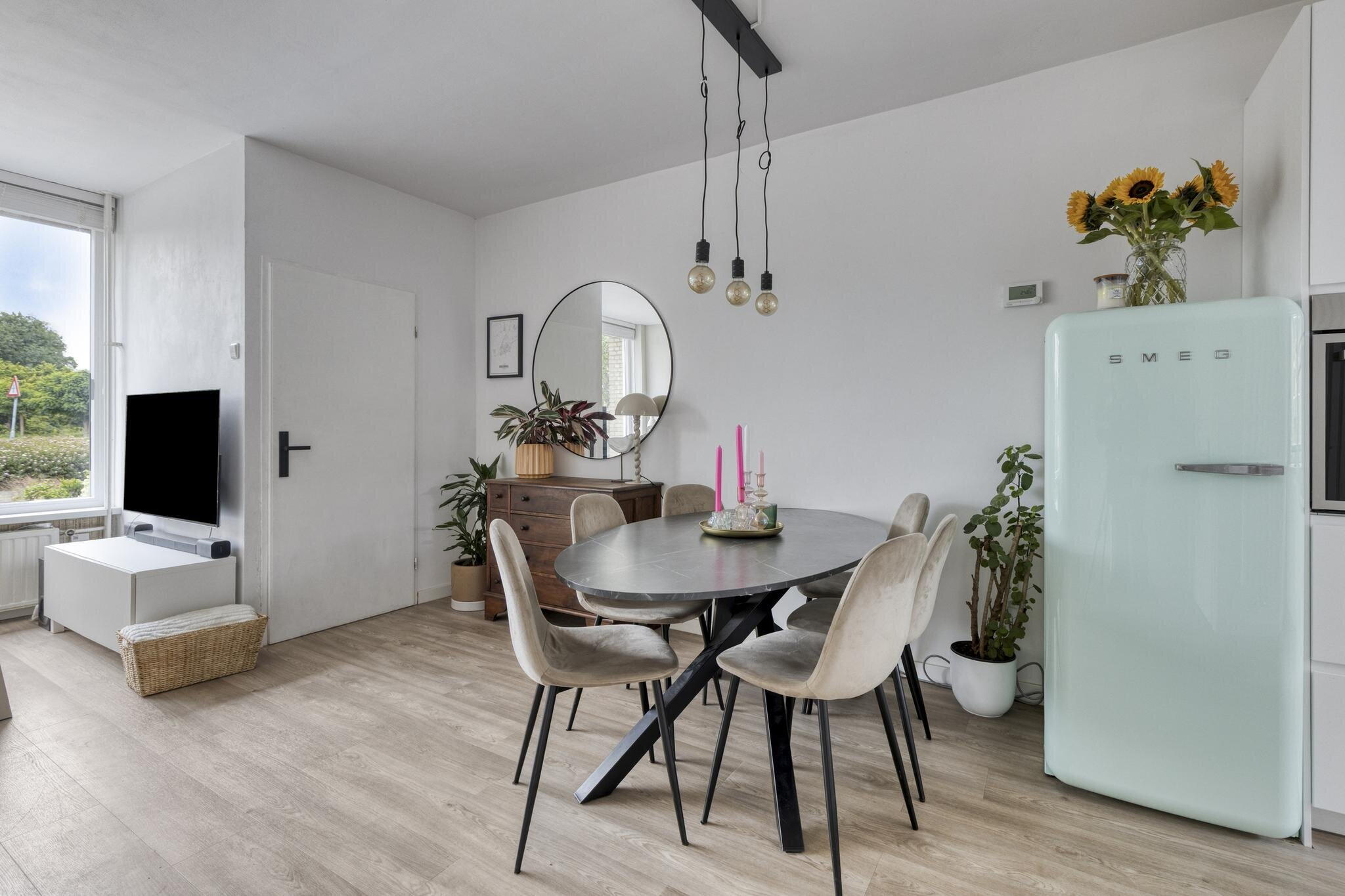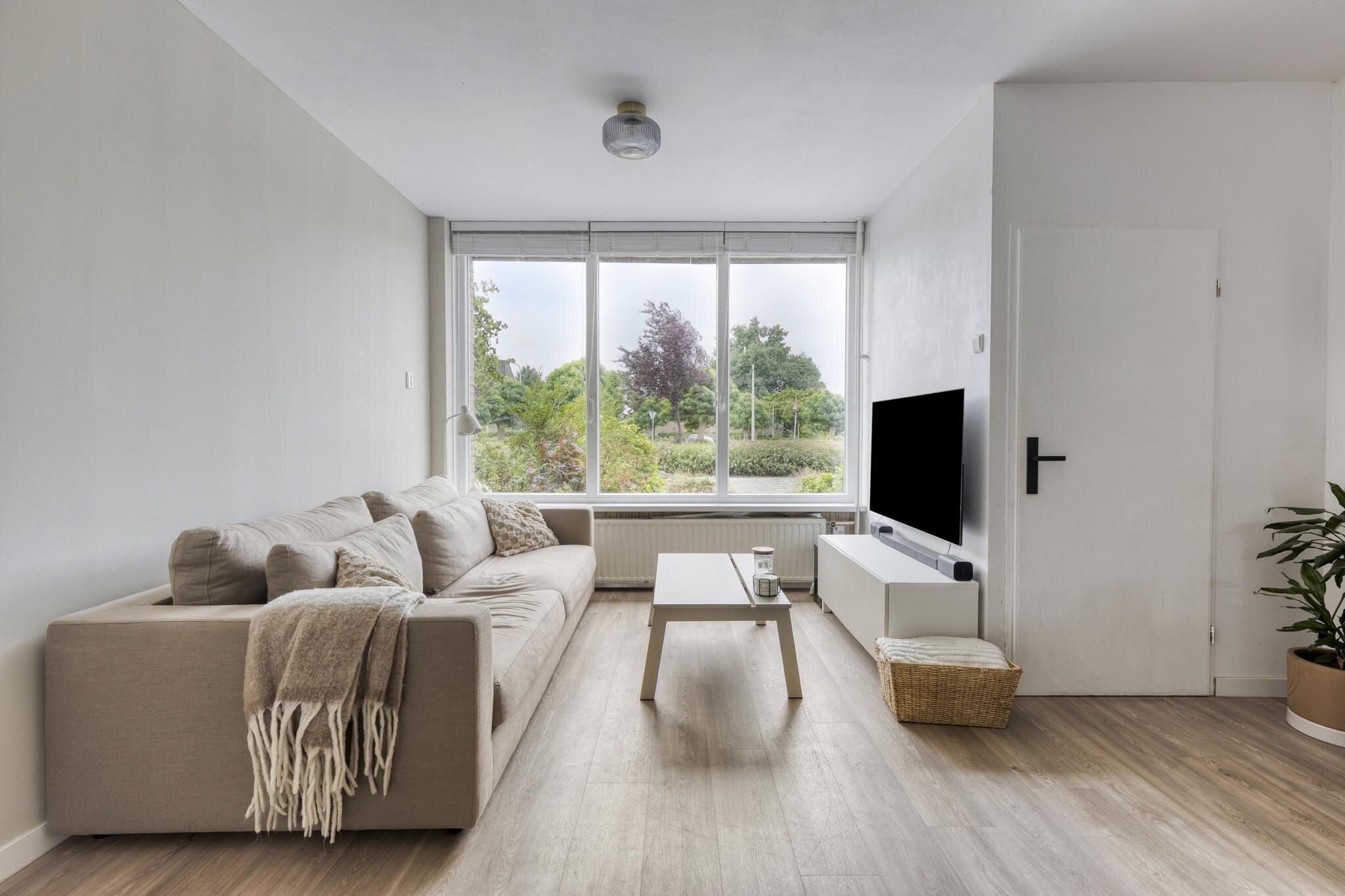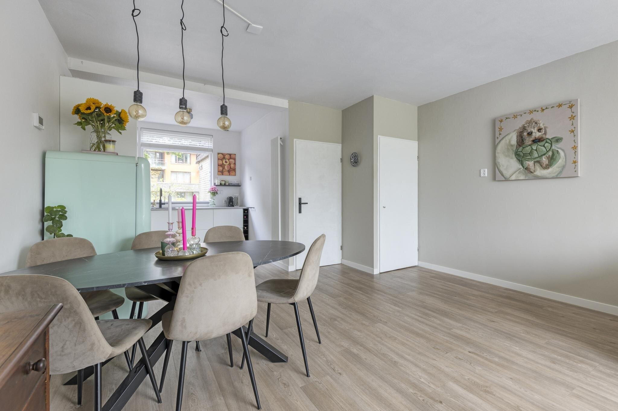 De woonkamer voelt licht en uitnodigend aan. Dankzij de grote ramen aan de voorzijde valt het daglicht rijkelijk naar binnen. Het zitgedeelte bevindt zich aan de voorzijde van de woning, ideaal voor een knusse bankhoek. In het midden van de ruimte is plek voor een eettafel, perfect voor lange etentjes met vrienden of familie. Achterin vind je de strakke, moderne keuken in wit. Greeploos, strak, en van alle gemakken voorzien: kookplaat, oven, afzuigkap, vaatwasser en een luxe Quooker. De losse koelkast kan worden overgenomen. Vanuit de keuken kijk je uit op de achtertuin, wat koken nog net iets leuker maakt!