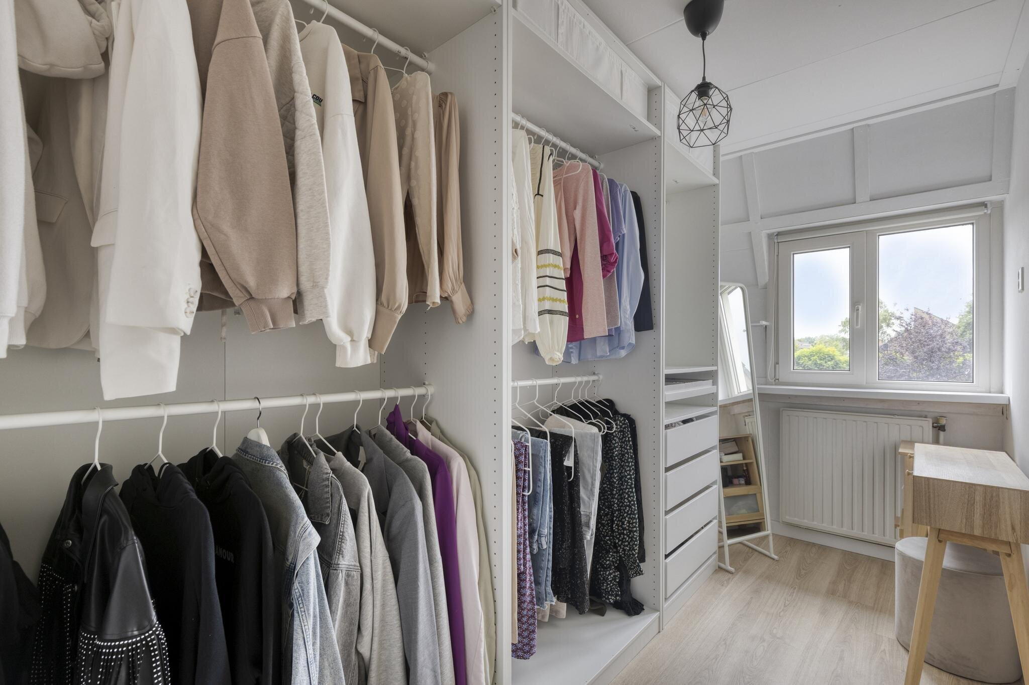 Op de eerste verdieping bevinden zich drie slaapkamers. Aan de achterzijde ligt de royale master bedroom, groot genoeg voor een kingsize bed én een kledingkast. Aan de voorzijde liggen nog twee slaapkamers, waarvan één momenteel wordt gebruikt als inloopkast. De andere is ook ruim van formaat en goed in te richten als werk- of kinderkamer. De badkamer is echt een plaatje: modern en sfeervol afgewerkt met beige tegels en zwarte accenten. Je vindt er een inloopdouche en een stijlvol wastafelmeubel met waskom.