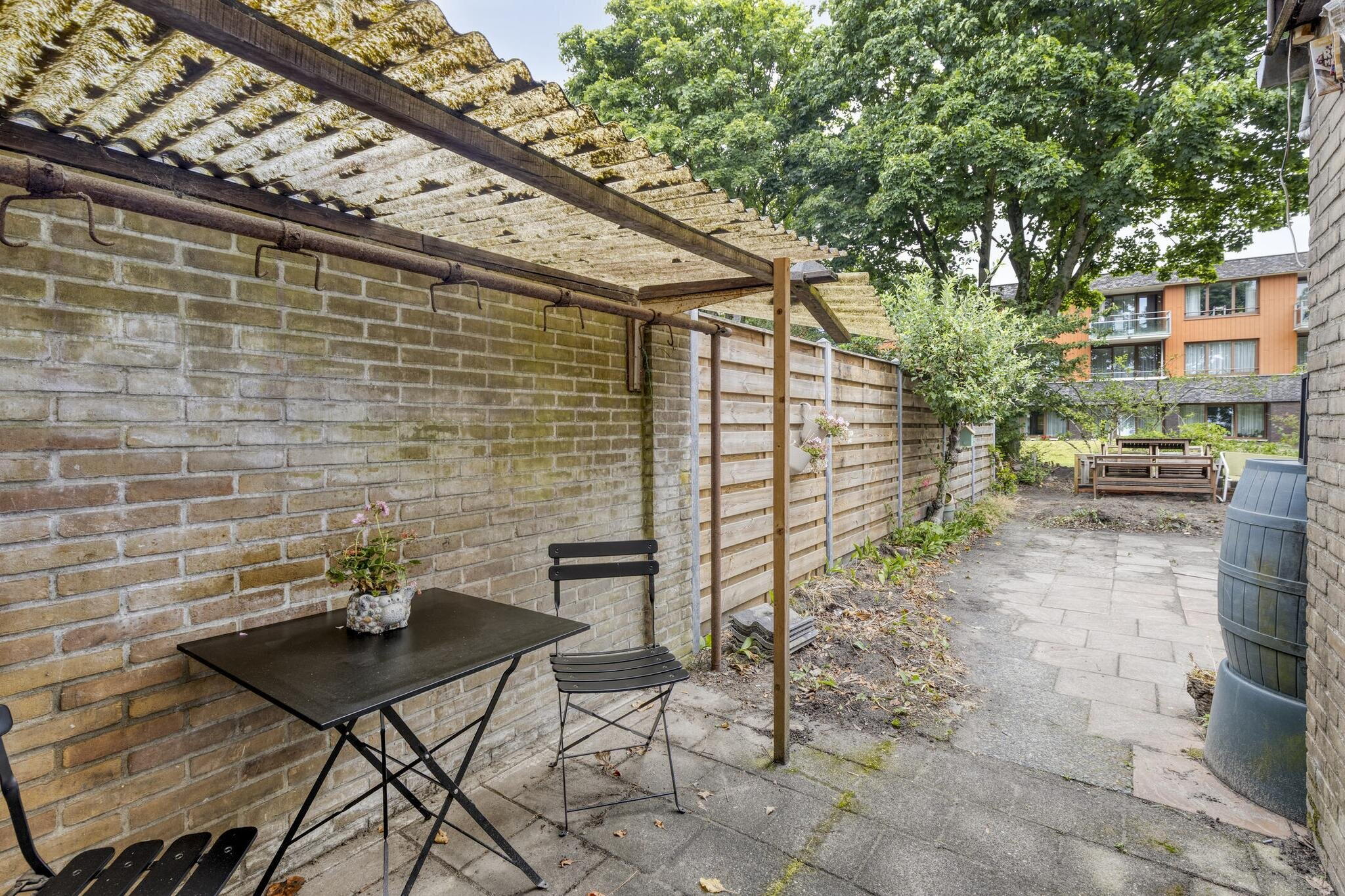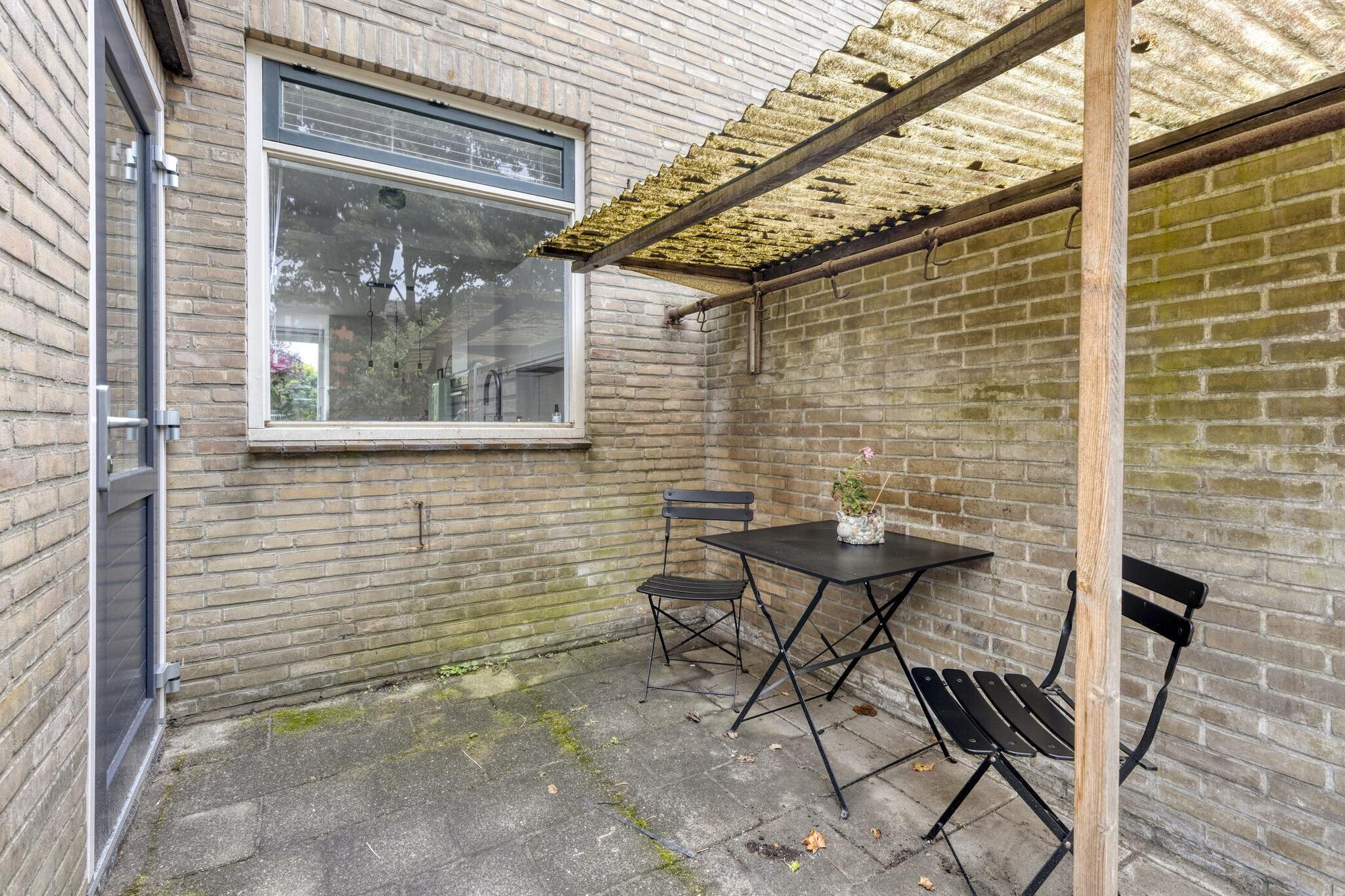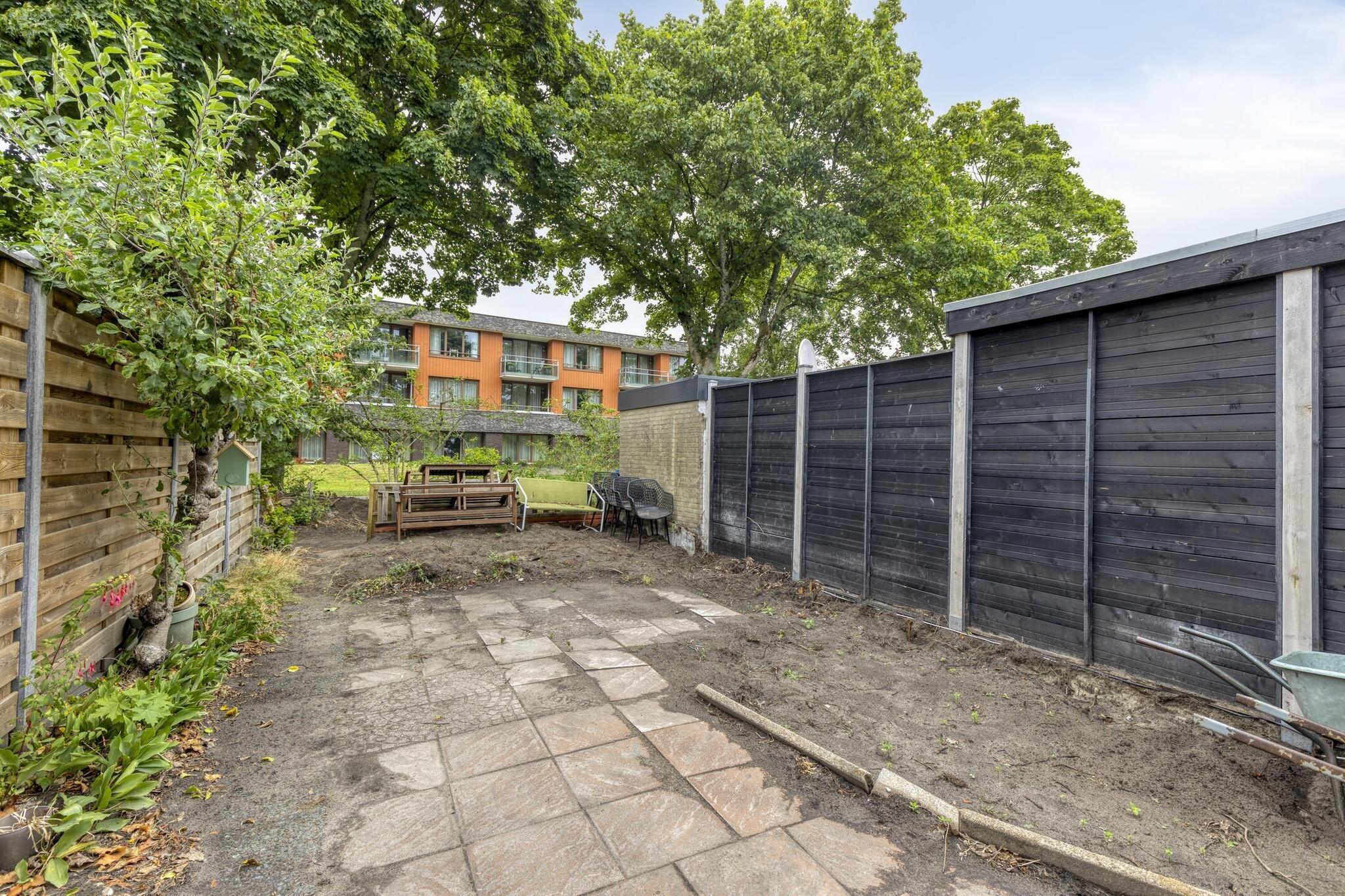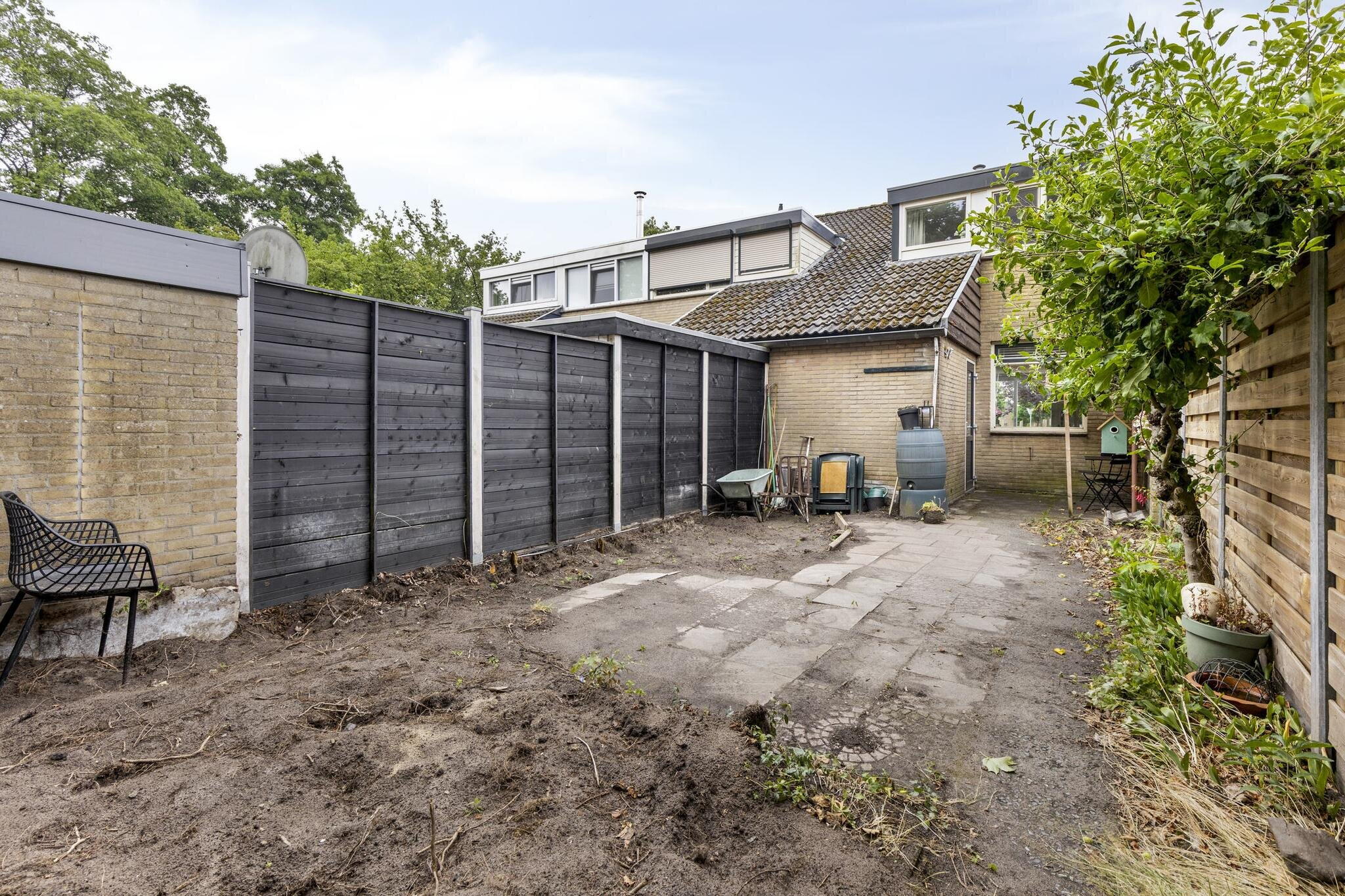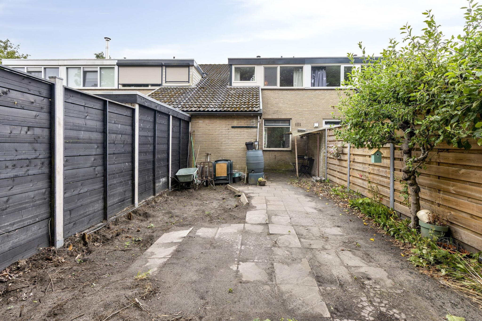 De achtertuin is volledig betegeld en biedt genoeg ruimte voor een loungeset of eettafel. Een heerlijke plek om te relaxen, al verdient de tuin wellicht nog wat liefde van een groene vingers.